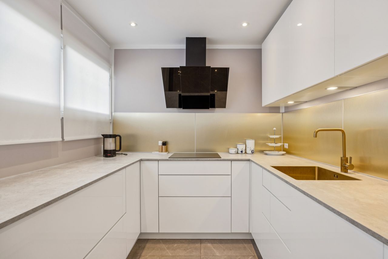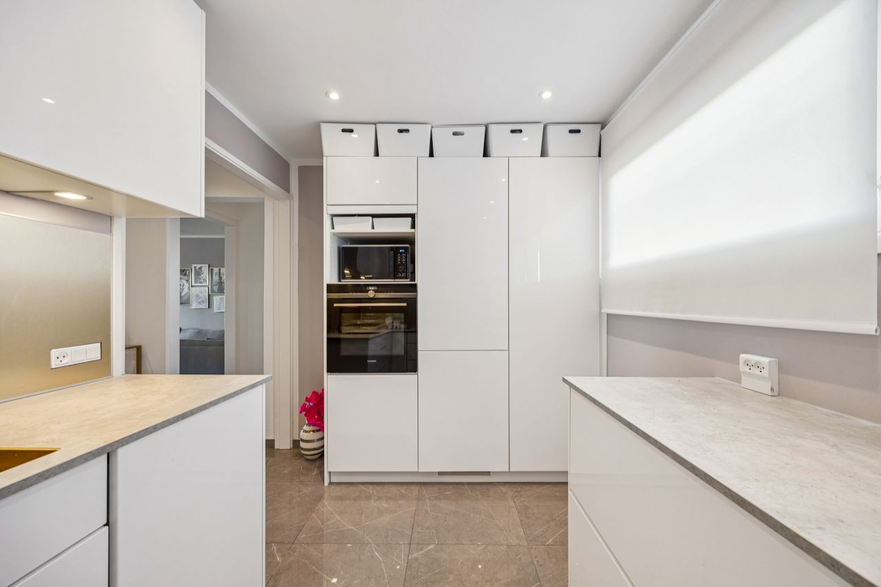 Køkkenet fremstår stilrent og indbydende med god skabsplads og en naturlig sammenhæng til opholdsrummet, hvor der er plads til både spisebord og sofaarrangement. Badeværelset er udført med separat bruseniche og toilet – en sjælden luksus i denne type lejligheder.