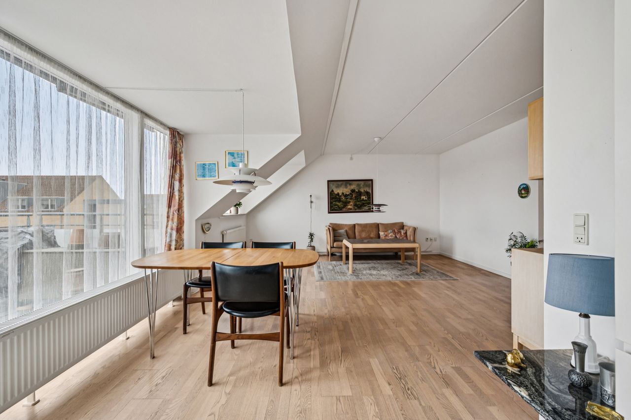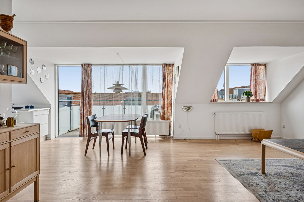 Byggeriet er fra 2006, så lejligheden er i god og indflytningsklar stand. Der er flotte trægulve i alle opholdsrum og em helt ideel planløsning. Der er i alt tre værelser, hvor de to af dem er rigeligt store til soveværelser, mens det sidste egner sig til kontor, børneværelse, gæsteværelse eller måske en walk-in garderobe. Stuen er meget indbydende og lys. Man bliver helt betaget af det fantastiske lysindfald der møder en her, det er virkelig det værd at komme at opleve. Det er ud fra stuen/køkken alrummet at du finder ud på den attraktive altan. Her skal du hverken bekymre dig om at solen er væk når du skal bruge den, eller om du mon har plads til et par gæster - begge dele kan hakkes af her. Køkkenet har klassiske hvide elementer og har fin bordplads samt opbevaring både i skabe, skuffer og endda også i diskrete overskabe. Der er opvaskemaskine til at klare hverdagen for dig. Badeværelset er af en rigtig god størrelse og har både vaskemaskine og tørretumbler installeret. Det er også værd at nævne, at der er et depotrum oppe i lejligheden, så du slipper for at skulle ned i en kælder for at komme til dine ting. Det er smart!