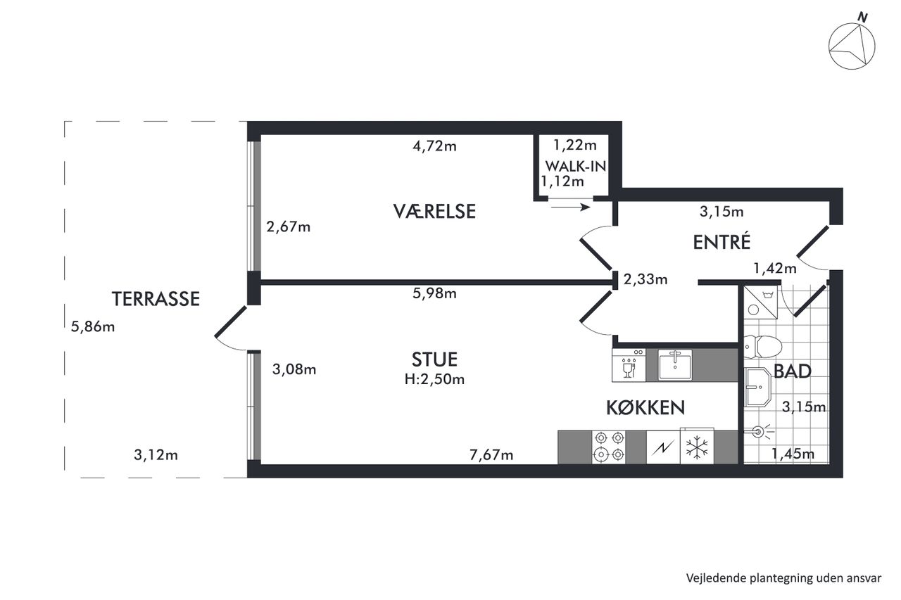 Lejligheden byder på en rummelig entré med god plads til overtøj og opbevaring. Herfra er der adgang til et stort og funktionelt badeværelse med separat bruseniche, toilet og praktisk vaskesøjle.