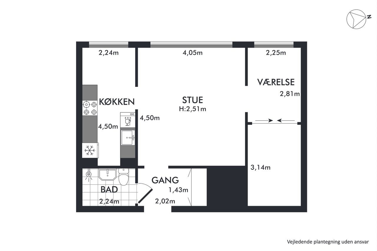 Lejligheden byder velkommen i en praktisk entré, der giver adgang til badeværelse/toilet og videre ind i den lyse stue. Stuen fungerer som hjemmets naturlige centrum og giver adgang til værelse samt køkken. Værelset er i dag delt op i 2, og er regulære og nemme at indrette, uanset om det skal bruges som soveværelse, kontor eller børneværelse. Køkkenet står tæt på det originale udtryk, har en hyggelig atmosfære og rummer plads til et lille spisebord.
